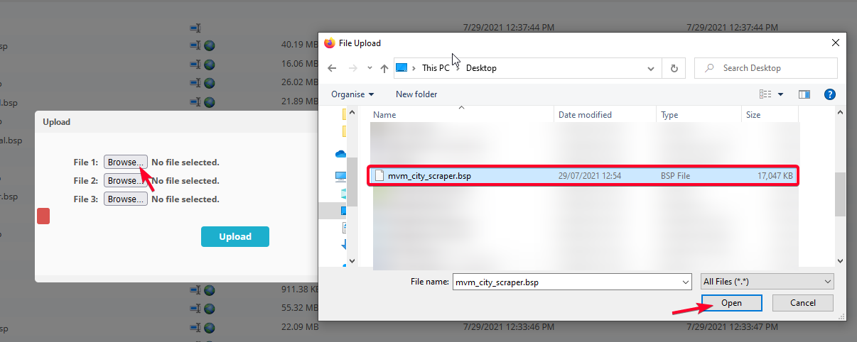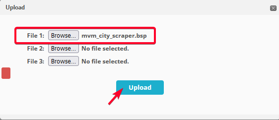 - Once you have selected the map file and opened it, click the upload button which will upload the file to the server's files.