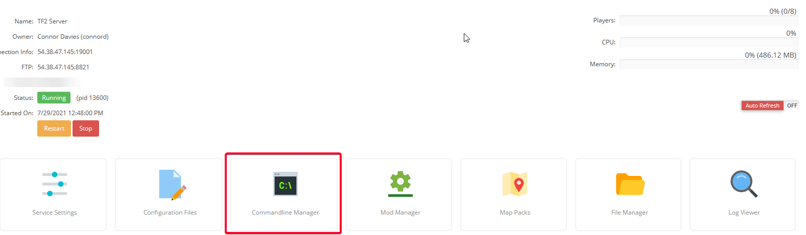 - Now that the map file has been uploaded to the server, the server now has to be told to use it, you can do this by navigating to the 'Commandline Manager' in the gamepanel.