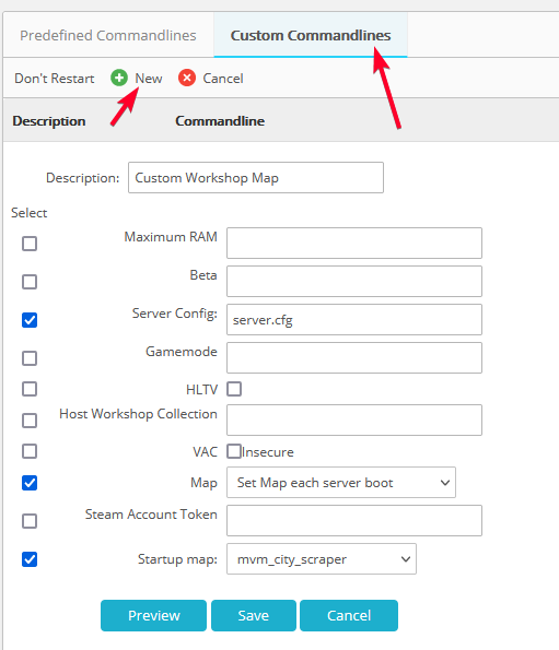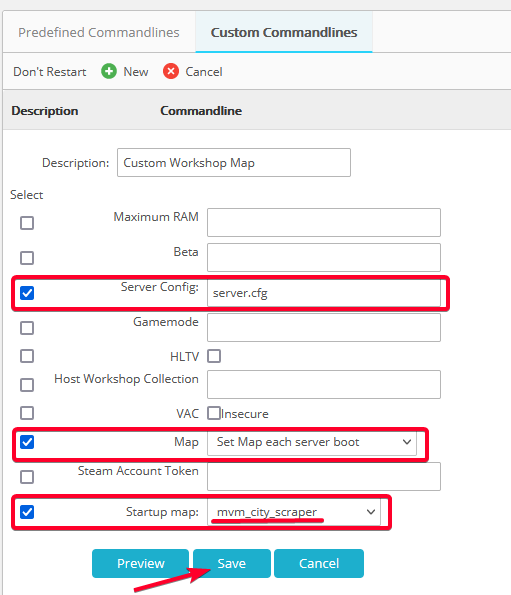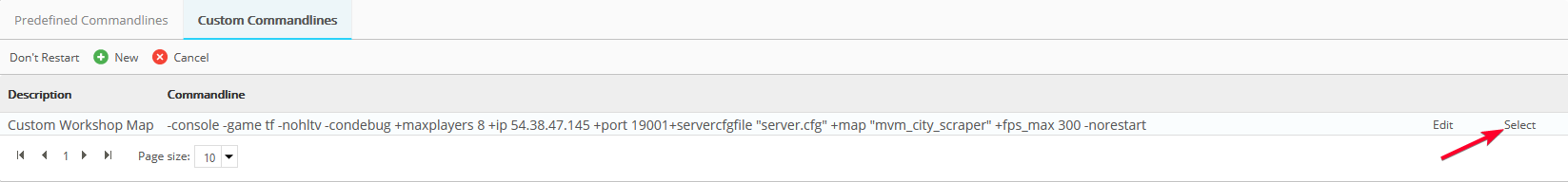 - Once you have saved the command line, you will need to select it for the server to run using that command line and the new map you selected using the 'select' button next to the command line.