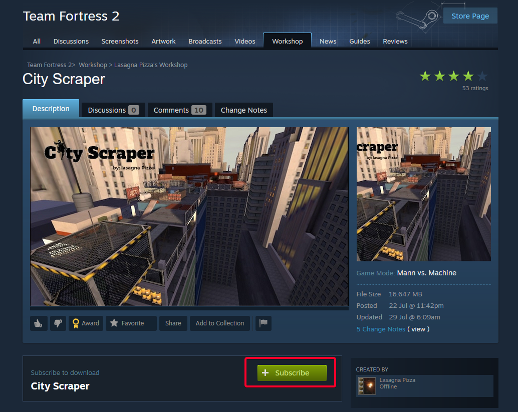 - Find a map that you would like to add to your server from the TF2 Steam Workshop and click the subscribe button.