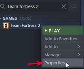 - Go to your Steam library and find your TF2 game, right-click and go to properties.