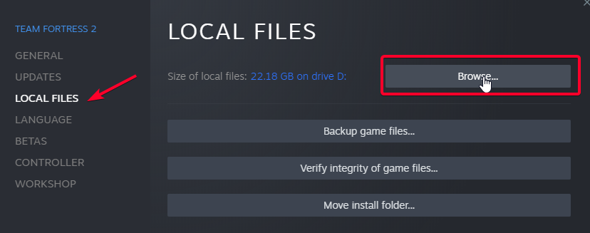 - When the game properties box comes up, navigate to 'Local Files' on the left and then click the 'Browse' button, this will open up the game files location on your PC.