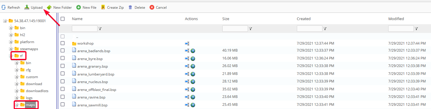 - Within the File Manager, you want to navigate into 'tf > maps' and within the maps folder, you will then need to upload the map you downloaded and saved previously.
