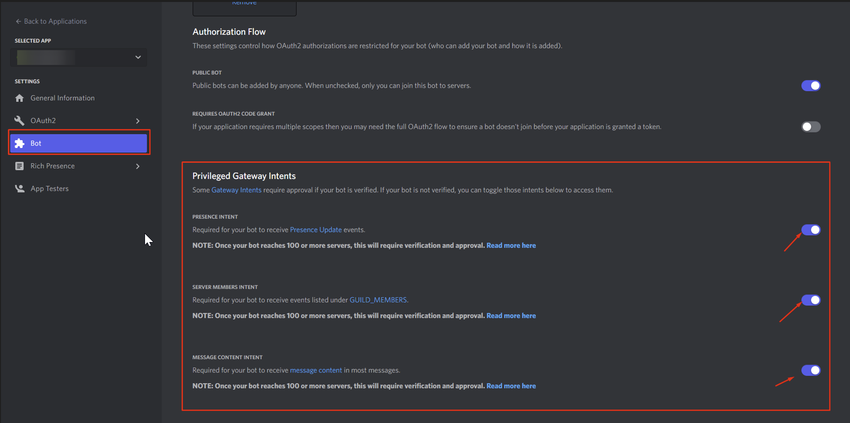 tab on left menu and be sure that all bot intentions are enabled under thePrivileged Gateway Intents