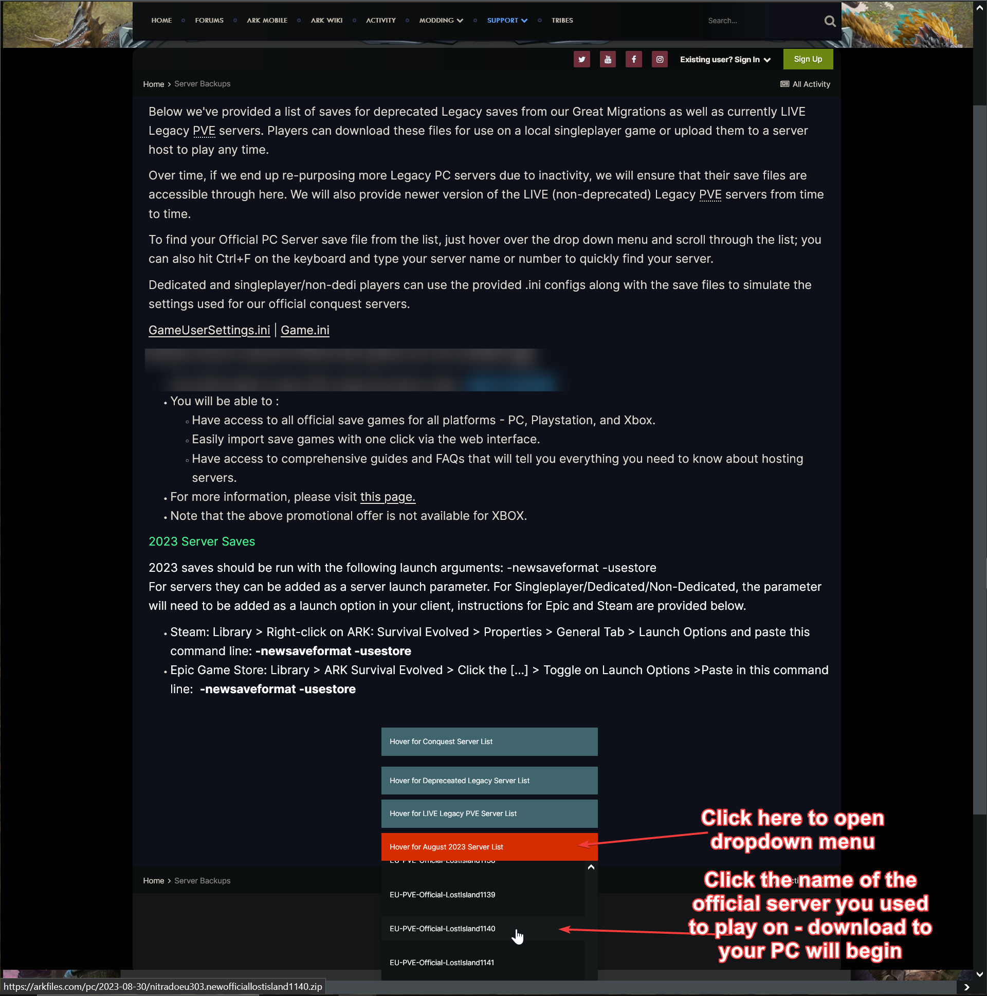 Simply click the drop-down menu then click the name of the official server you used to play on - that'll download the official server save files to your PC. On some browsers you may need to right-click the official server name then left click on "Save Link As"
