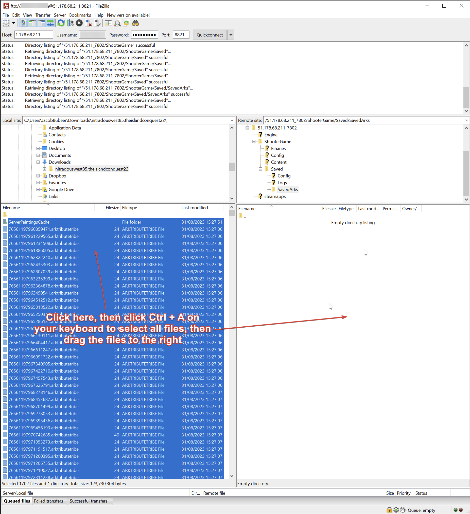 Select all files & upload toServerRoot/ShooterGame/Saved/SavedArks