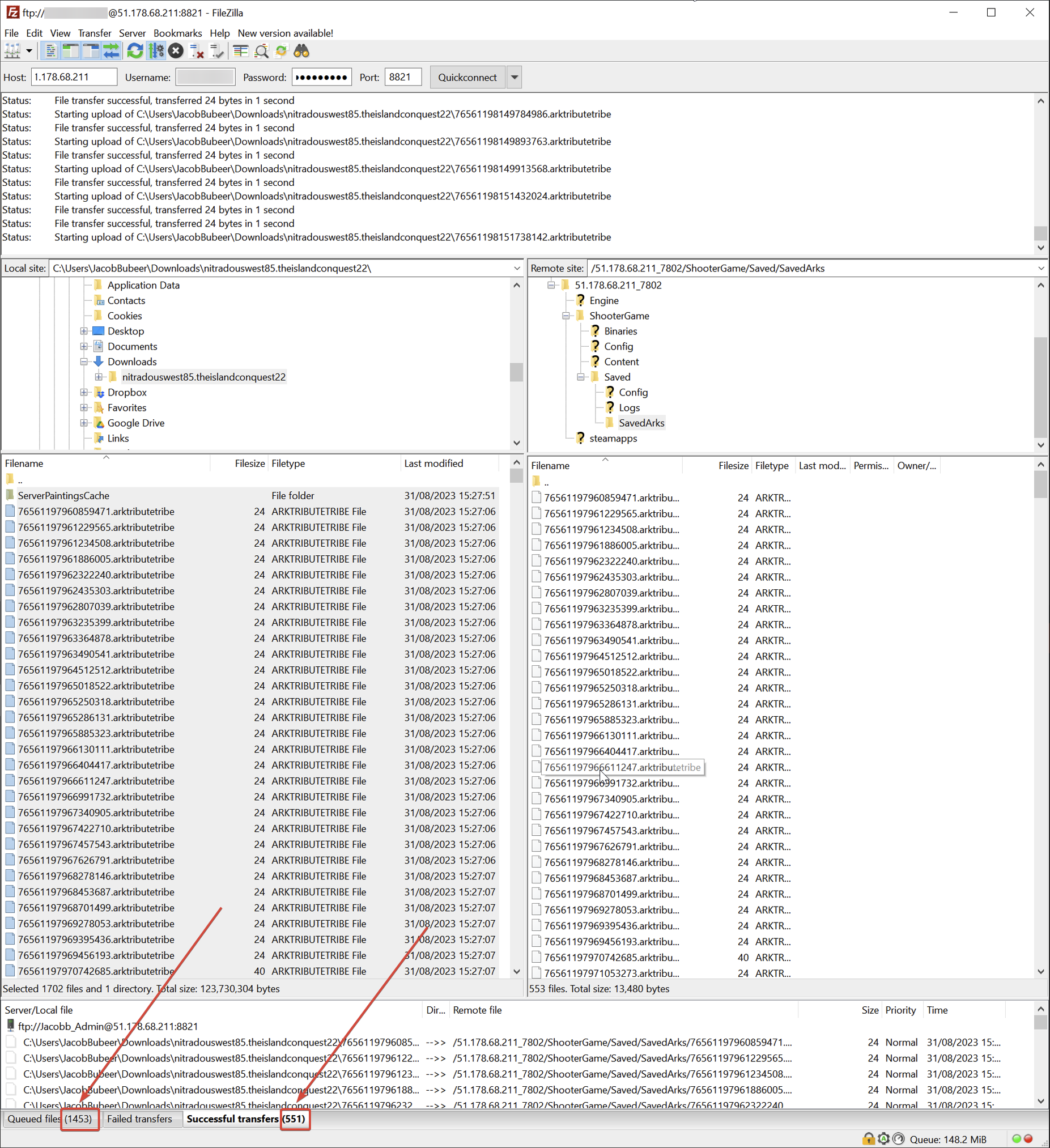Note: You will know the transfer has completed because at the bottom of FileZilla it'll say "Successful Transfer (Number of files in official save data folder)" and Failed Transfers won't have a number.