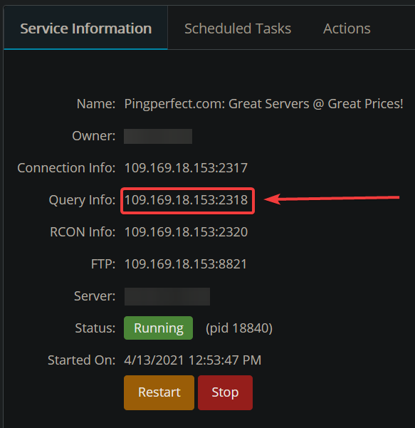 - Copy your query info from the gamepanel home page of your server