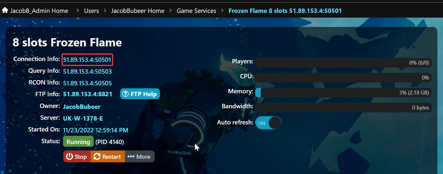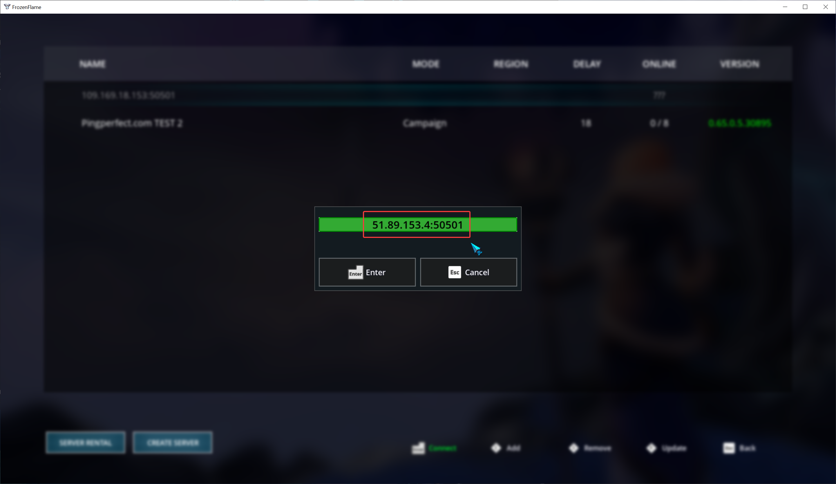For Example, for our test server it would be 51.89.153.4:50501 as shown in the images below: - Press the "Enter" key.