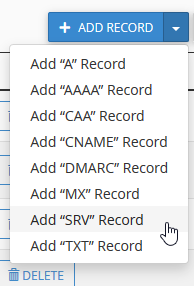 - Click into the "Add Record" dropdown menu and then select Add "SRV" Record