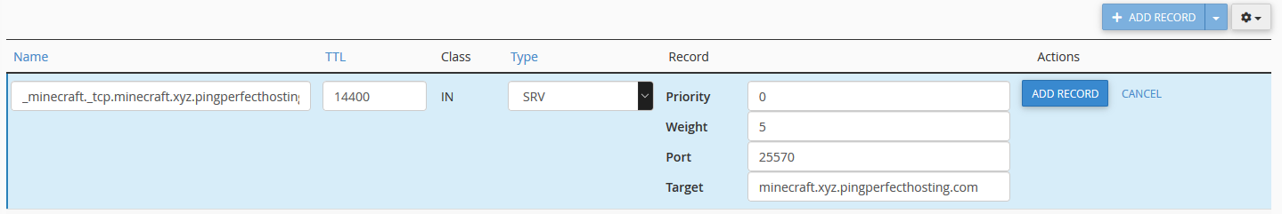 Zone Name: _GameName._tcp. - for example _minecraft._tcp. – (the rest of your domain name will autofill)