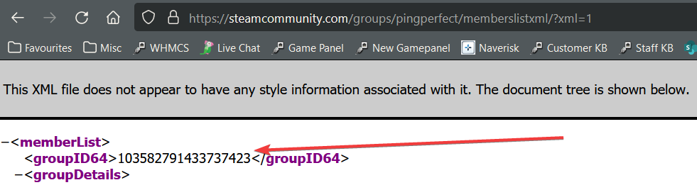 https://steamcommunity.com/groups/pingperfect/memberslistxml/?xml=1 - Visit the URL created in step 2, it will show you XML code, at the top of which you will find your Steam groups ID.