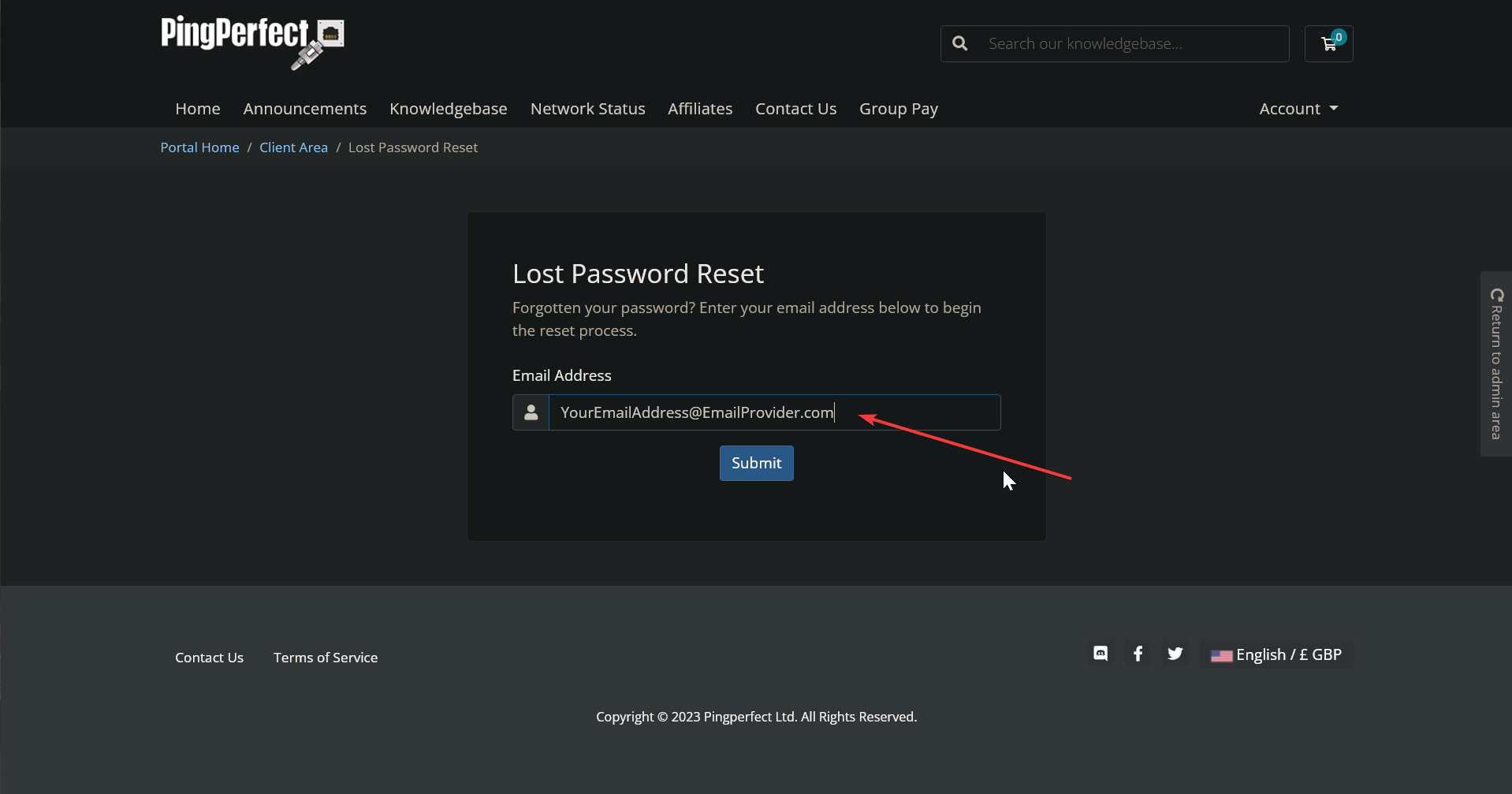 Type in the email address of your Pingperfect website / billing account and then click submit.