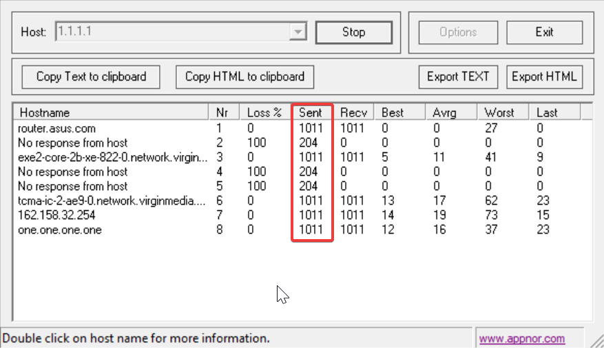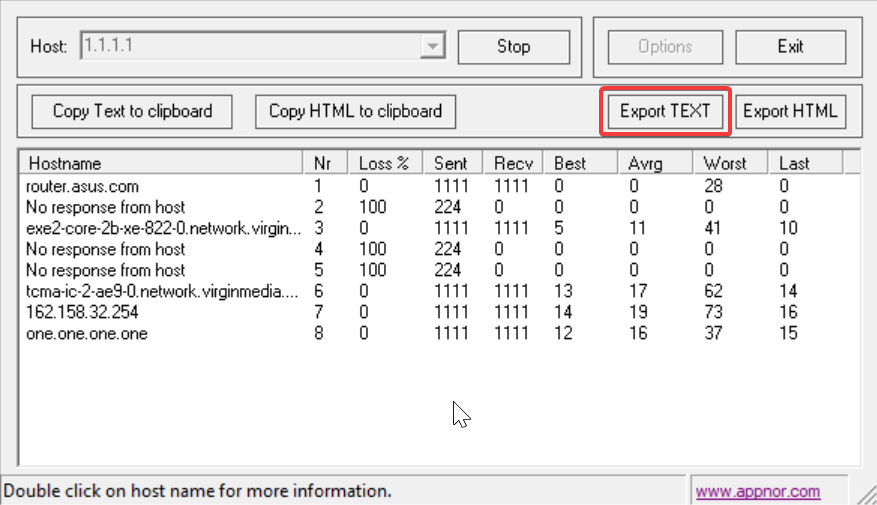 - Click "Start" and run it for around 1000 pings (as shown in the 1st image below) during a period where you're experiencing latency issues, and once that's done, save the results as a text or .txt file by clicking "Export TEXT" (as shown in 2nd image below), and add the file to your reply to us.