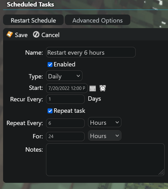 IMPORTANT: Do not set two tasks to run at the same time, they will clash and neither will work properly. For example, if you set up automated backups to occur every 2 hours starting at 12:00AM, do not also set up server restarts to occur every 2 hours at 12:00AM