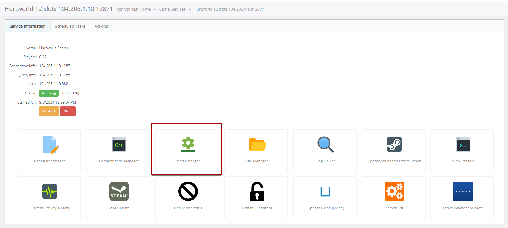 - Log into your gamepanel account, open your Hurtworld service and navigate to the 'Mod Manager'.