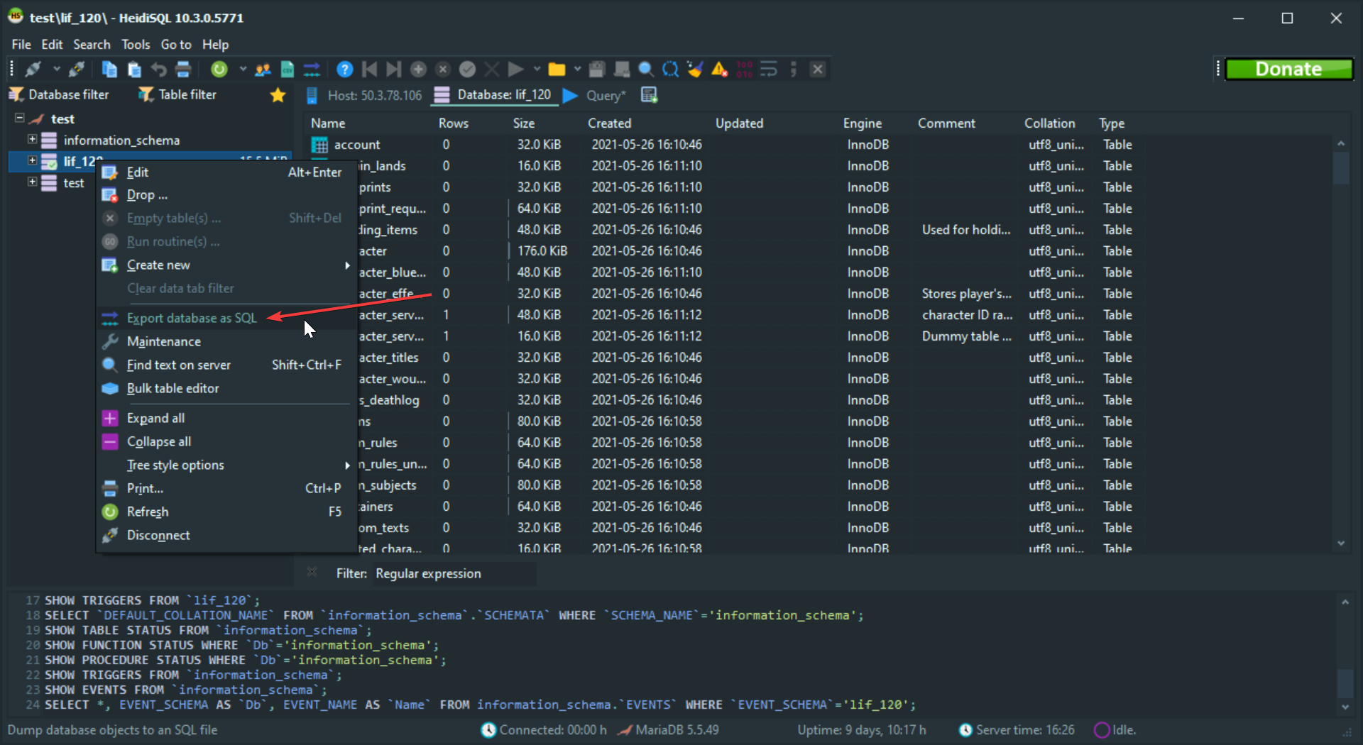 It should look like this - Press the "export" button - it will take a while to back up the database but once it's done you will have a .sql file at the location you chose in step 11 which represents your server's database.