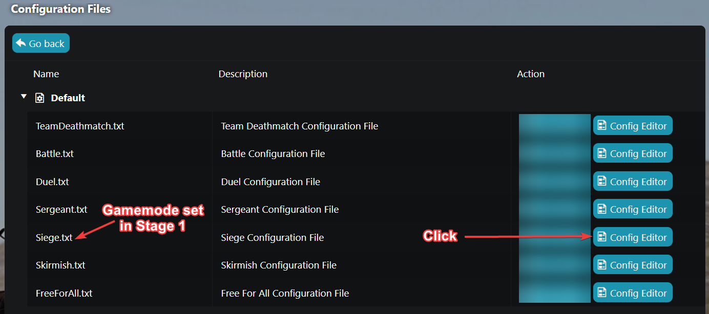 For example, in this guide we changed the server to "Siege" game mode in Stage 1, so we want to edit Siege.txt using the config editor. - Refer to the Example Configuration below and change the respective settings where you need to do so in order to configure your server to your desires.