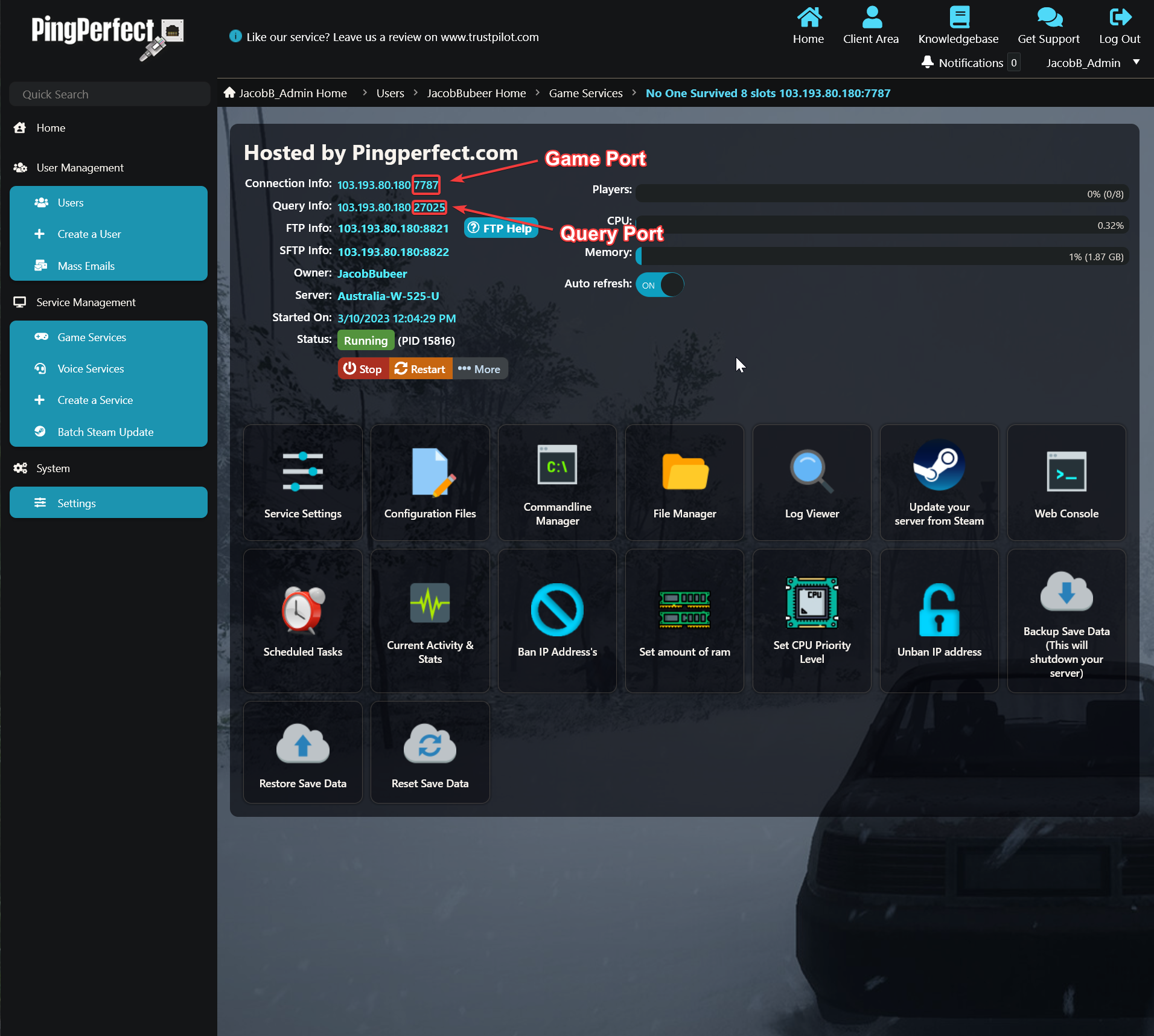 - Check "Connection Info" for Game Port - it'll be something like 103.193.80.180:7787 - the part after the : is your game port