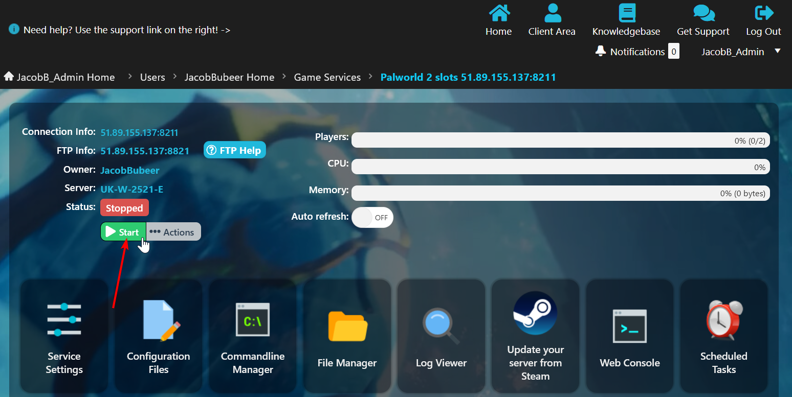 - Connect to your server using the RCON Info on your server's Gamepanel home page.