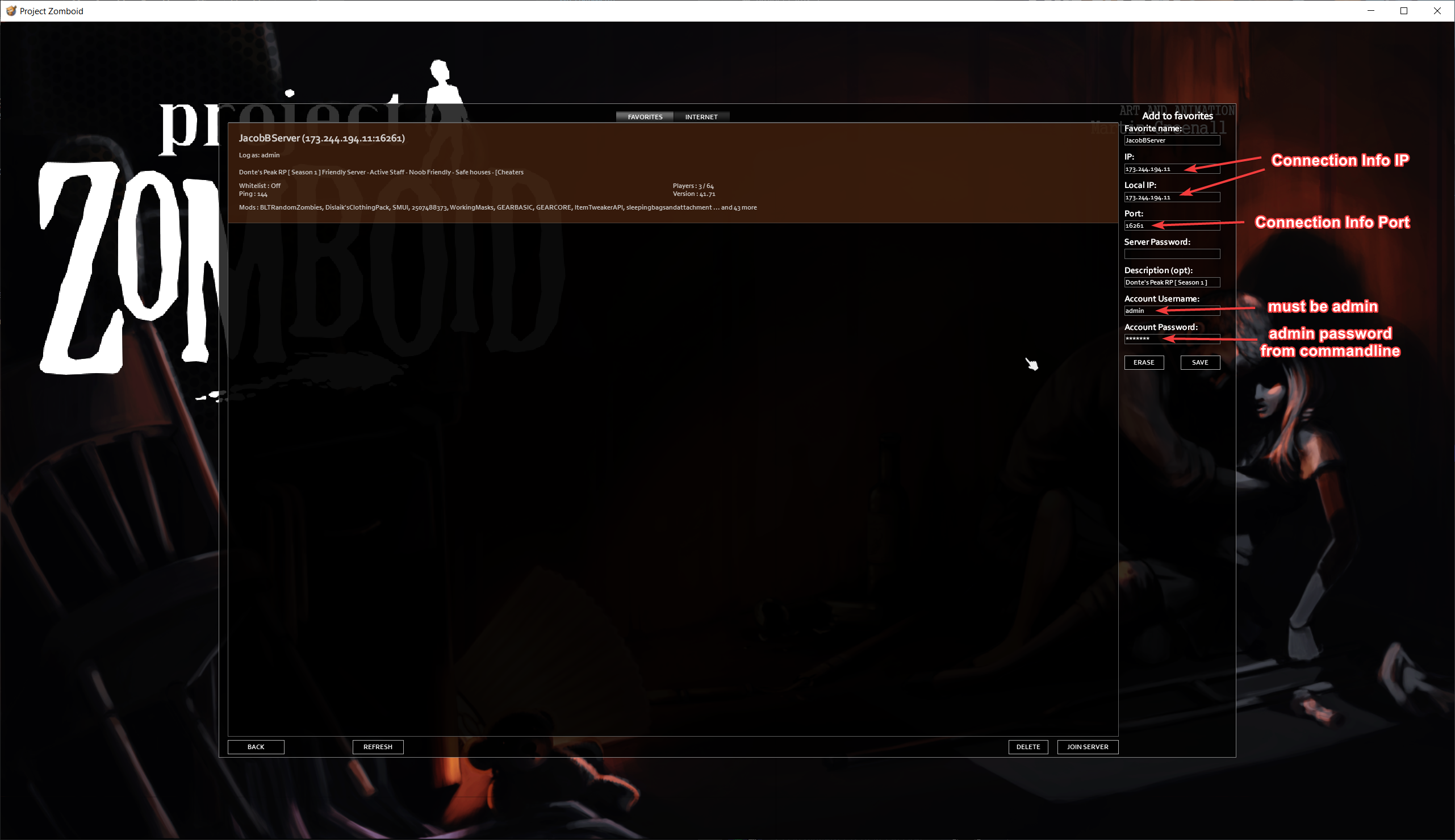 - Log into the server with the username "admin" and the admin password you set in the commandline, as well as the other server details. As shown below: