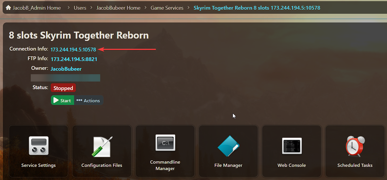 On your game panel home page, under the label "Connection Info", copy / make note of the IP:Port shown