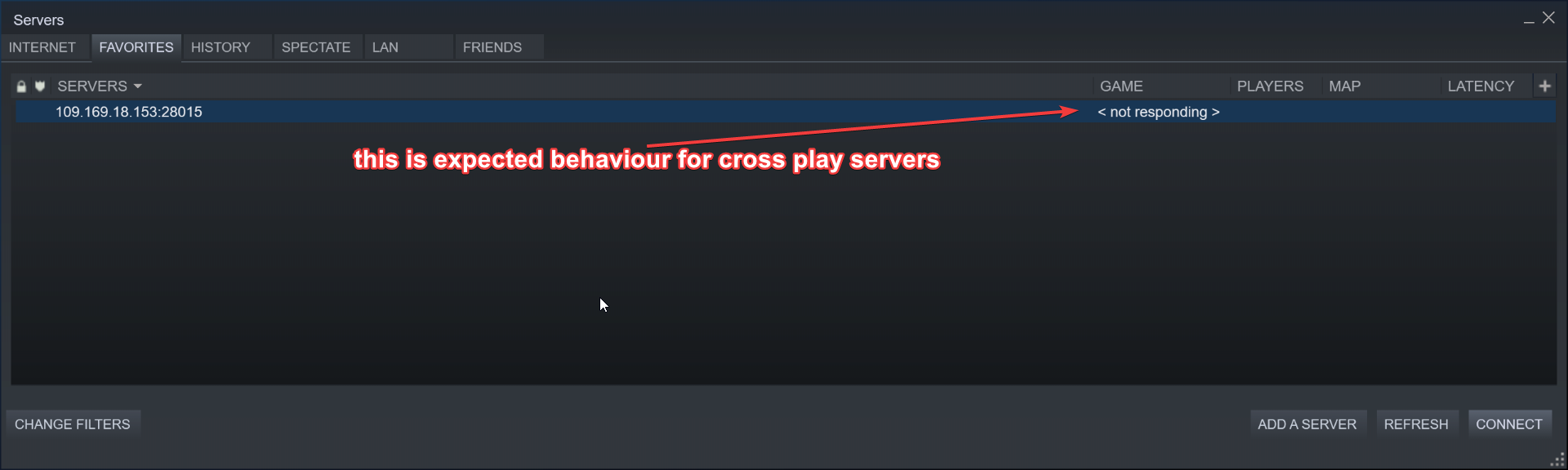 WARNING: Cross play servers appear in a different category on the in-game server list, make sure you select the "EOS" category in the server browser as shown in the below screenshot.