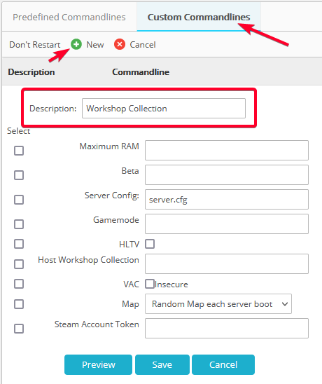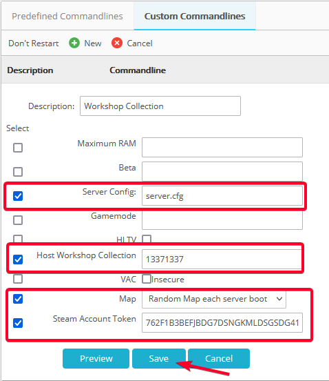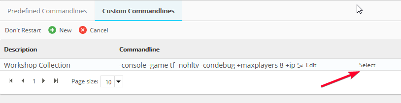 - Once you have saved the command line, simply select it which will force the server to use the new command line by clicking the 'Select' button.