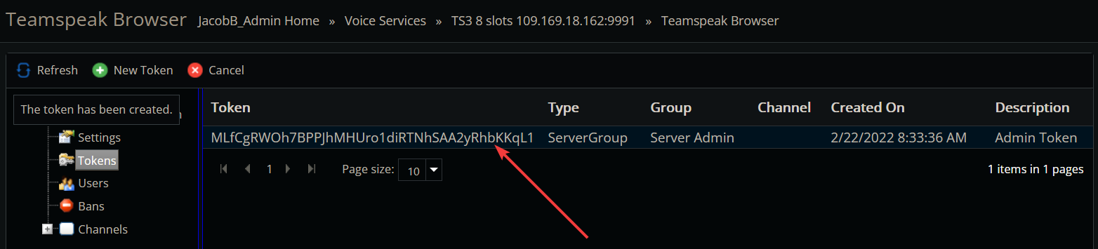 Note the token can only be used ONCE. After you're logged in as a Server Admin you can create a new token for someone else to use by going to Permissions > Token Manager > Add Token and choosing Server Group for type and Server Admin for group then clicking Create. You can then email or provide the token to another user allowing them to do the same thing.