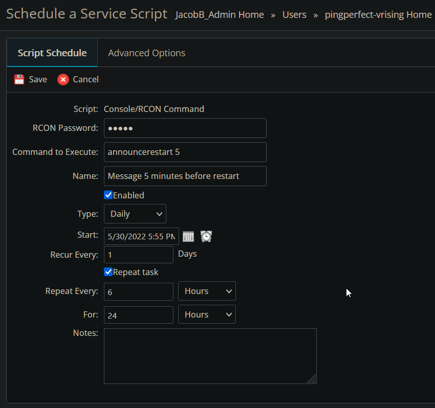 - Type in the command you want to automate in the Command to Execute field (in this case it is announcerestart 5)