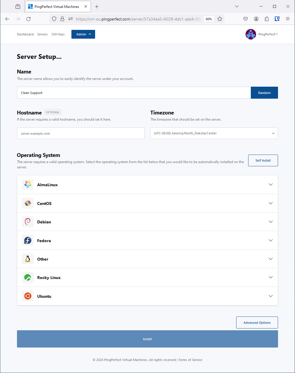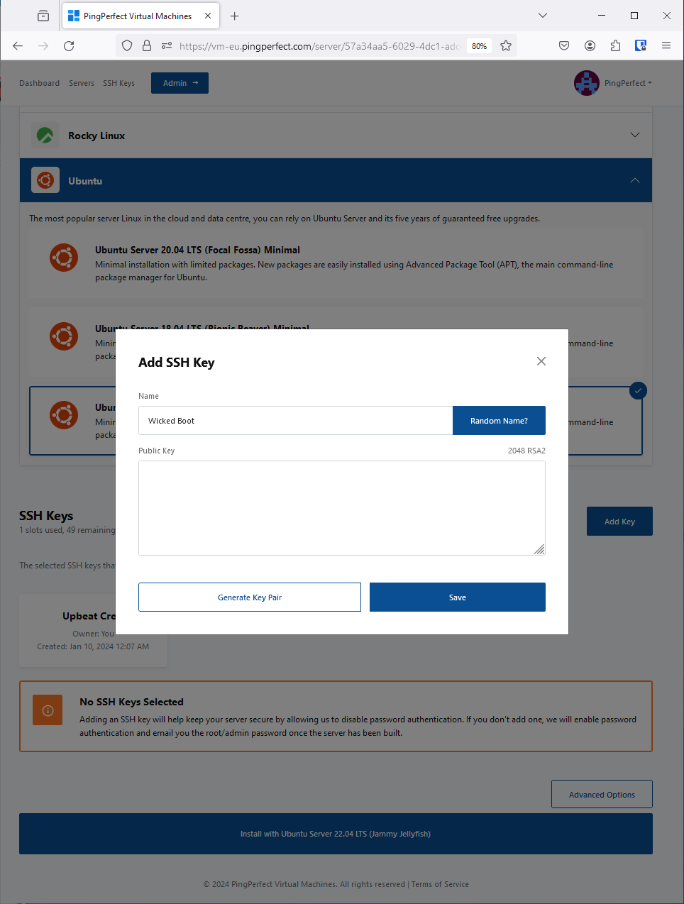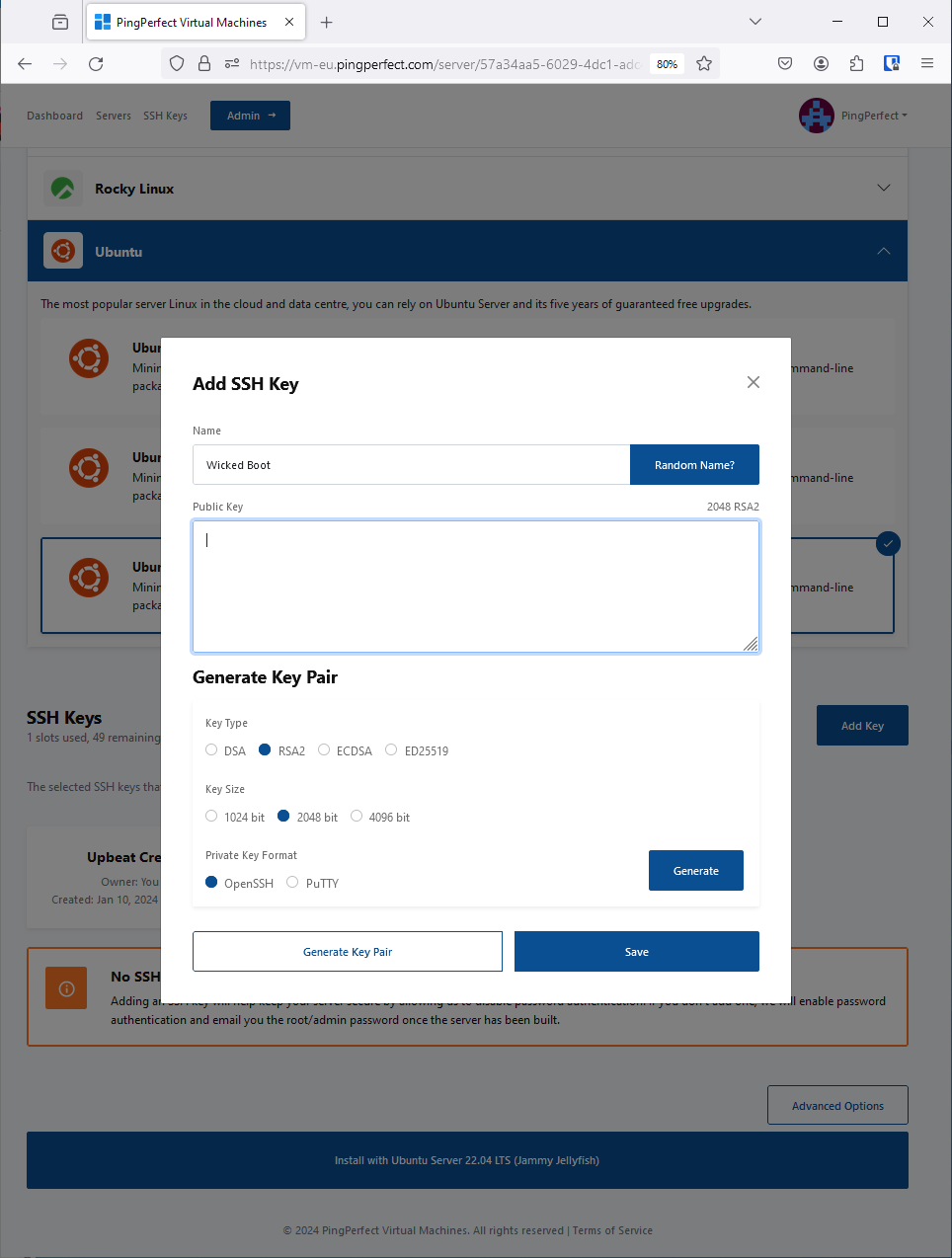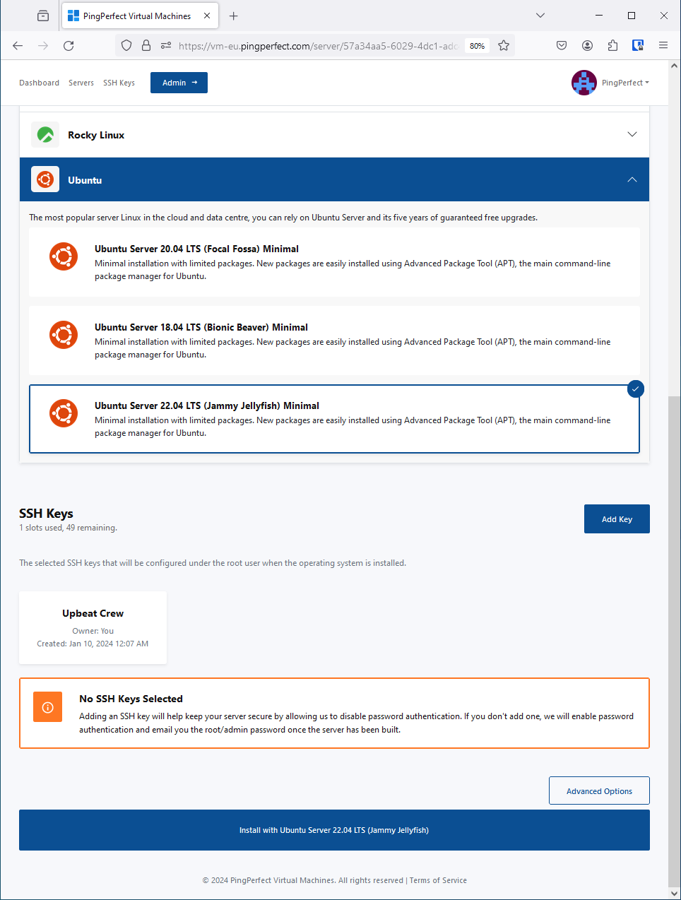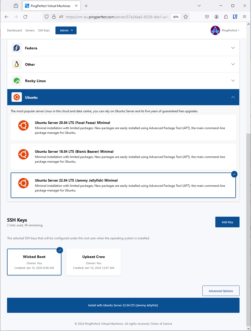 Choose the OS you want to install, then select an existing SSH key or Add Key.