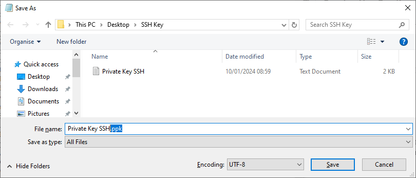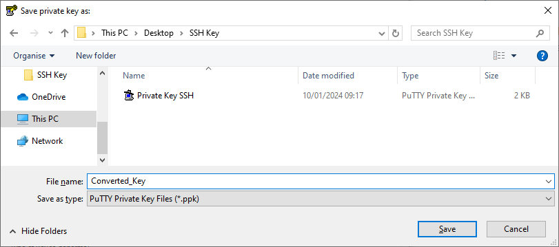 - Save the private key to your selected folder and give it a new and appropriate name. For example "Converted_Key".