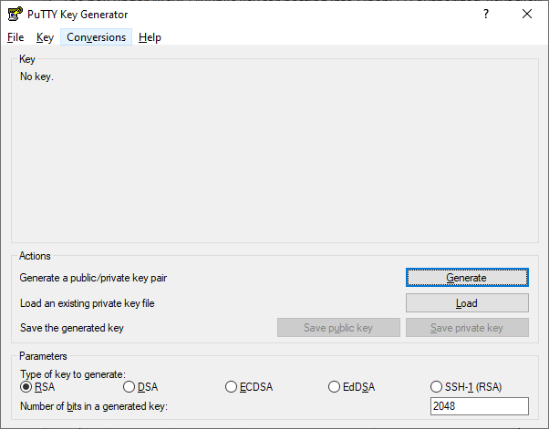 - Click "Conversions" from the PuTTY Key Generator menu and select "Import key".