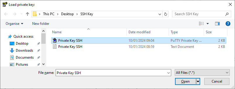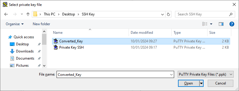 - Navigate to the Private Key SSH.ppk file and click "Open".