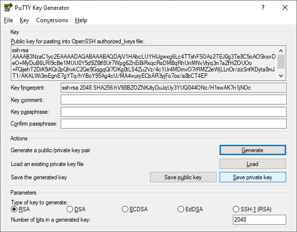 - Under "Actions" / "Save the generated key", select "Save private key".