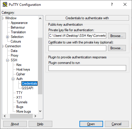- Navigate to "Connection" > "SSH" > "Auth" > "Credentials".