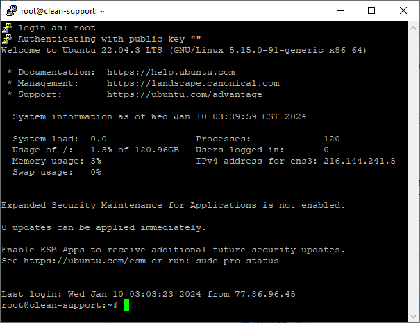 - Finally, click "Open" again to log into the remote VPS with key pair authentication and a new window will now open.